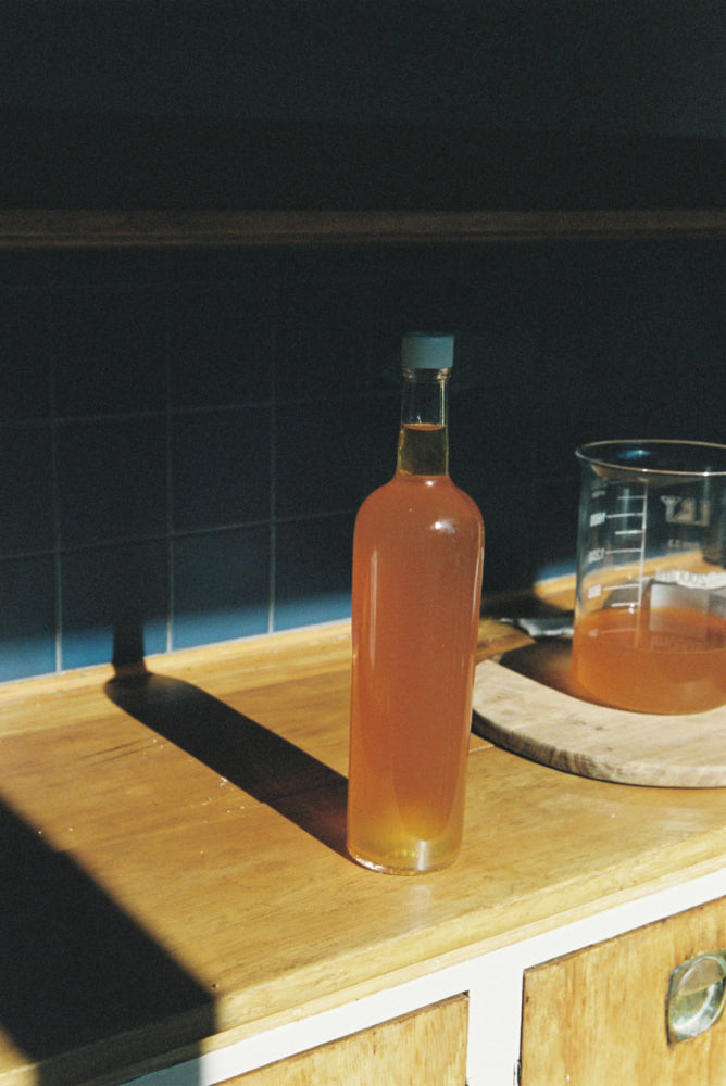 Place the fermenting vinegar in a warm, dark place, out of direct sunlight. (70°F is ideal.) Taste every week. Once the liquid tastes sharp and tart, bottle with a permanent lid and store to age for a year.